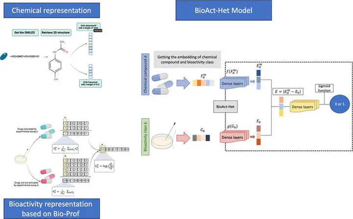 Drug failure during experimental procedures due to low bioactivity presents a significant challenge. To mitigate this risk and enhance compound bioactivities, predicting bioactivity classes during lead optimization is essential. The existing studies on structure–activity relationships have highlighted the connection between the chemical structures of compounds and their bioactivity. However, these studies often overlook the intricate relationship between drugs and bioactivity, which encompasses multiple factors beyond the chemical structure alone. To address this issue, we propose the BioAct-Het model, employing a heterogeneous siamese neural network to model the complex relationship between drugs and bioactivity classes, bringing them into a unified latent space. In particular, we introduce a novel representation for the bioactivity classes, called Bio-Prof, and enhance the original bioactivity data sets to tackle data scarcity. These innovative approaches resulted in our model outperforming the previous ones. The evaluation of BioAct-Het is conducted through three distinct strategies: association-based, bioactivity class-based, and compound-based. The association-based strategy utilizes supervised learning classification, while the bioactivity class-based strategy adopts a retrospective study evaluation approach. On the other hand, the compound-based strategy demonstrates similarities to the concept of meta-learning. Furthermore, the model’s effectiveness in addressing real-world problems is analyzed through a case study on the application of vancomycin and oseltamivir for COVID-19 treatment as well as molnupiravir’s potential efficacy in treating COVID-19 patients. The data and code underlying this article are available on https://github.com/CBRC-lab/BioAct-Het. However, data sets were derived from sources in the public domain.